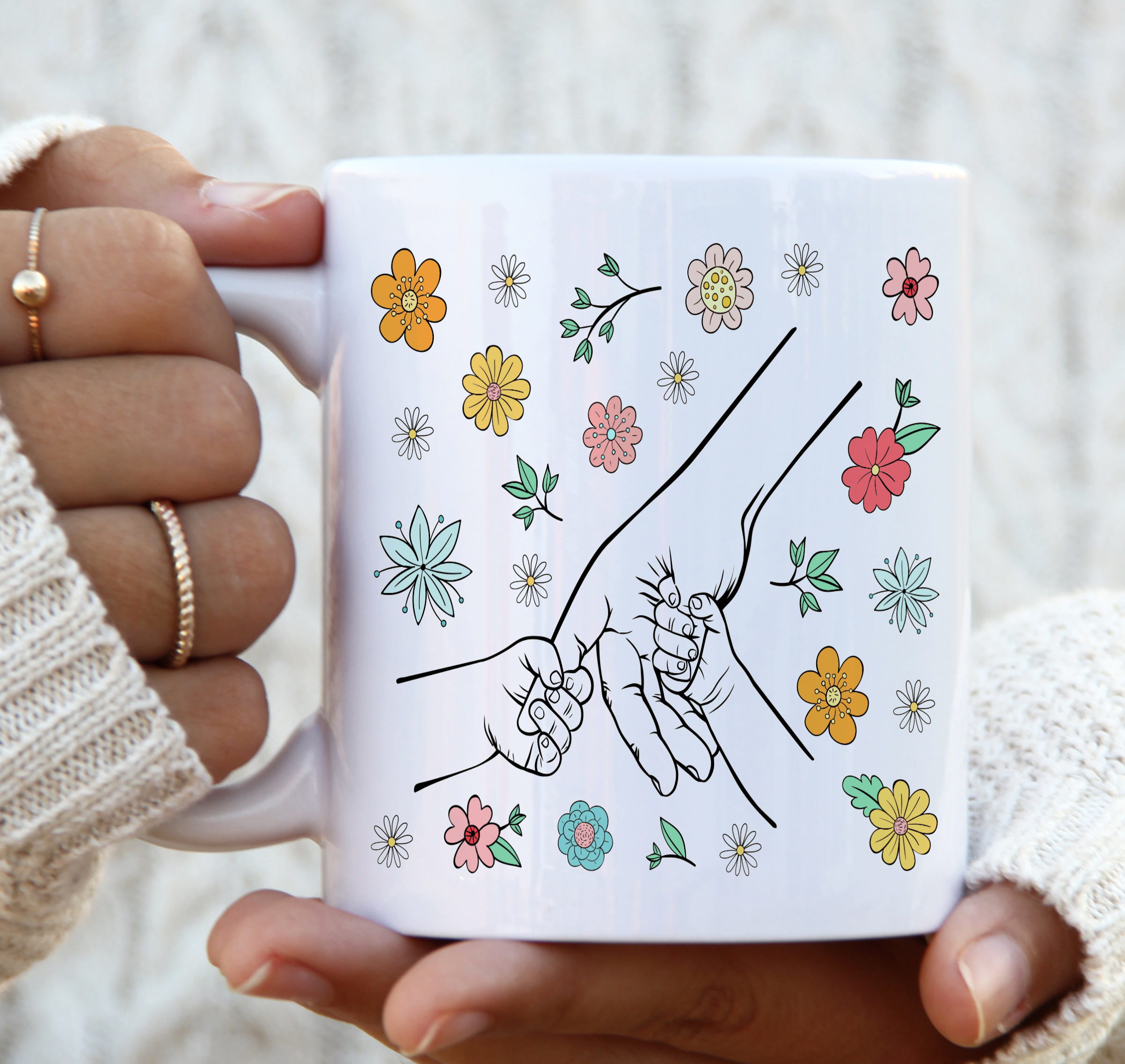 A “Many Hands Holding Mum’s Hand” mug is a heartwarming and thoughtful gift idea, often symbolizing the love and care of family members. The design typically features hands (representing family or loved ones) holding a central image of a mother’s hand, symbolizing the bond and support she receives from her children or family. It’s a lovely representation of love, family, and connection