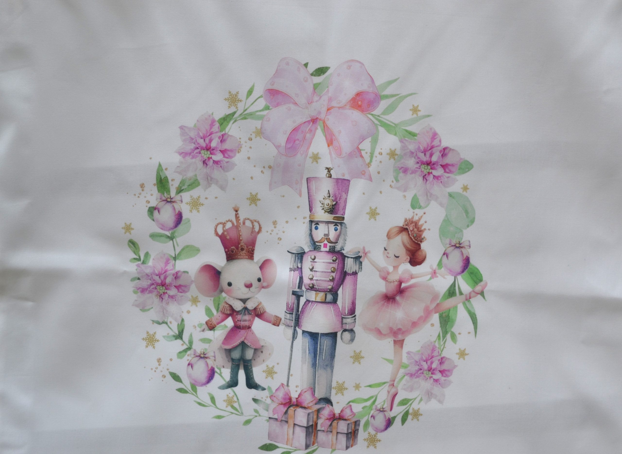 • Beautiful Nutcracker, Mouse King & Ballerina design framed in a festive wreath with delicate pastel details.